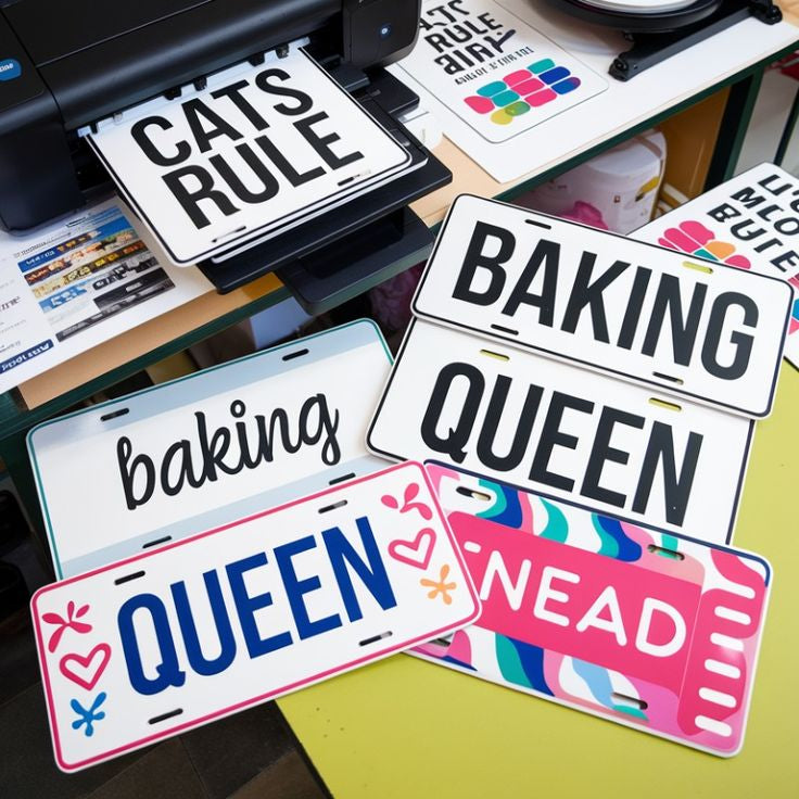 Tablilla de carro en aluminio sublimable, diseñada con tecnología de tinte por sublimación, que permite transferir tus diseños directamente a la superficie metálica posterior, logrando un acabado brillante y duradero que no se desvanece fácilmente.